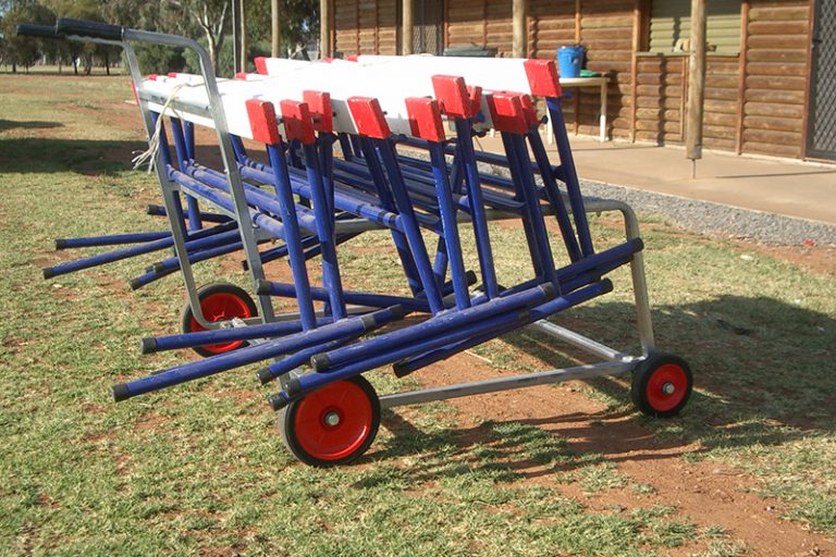 Holds approximately 15-20 hurdles (folding and non-folding). Used to store and transport hurdles to the track